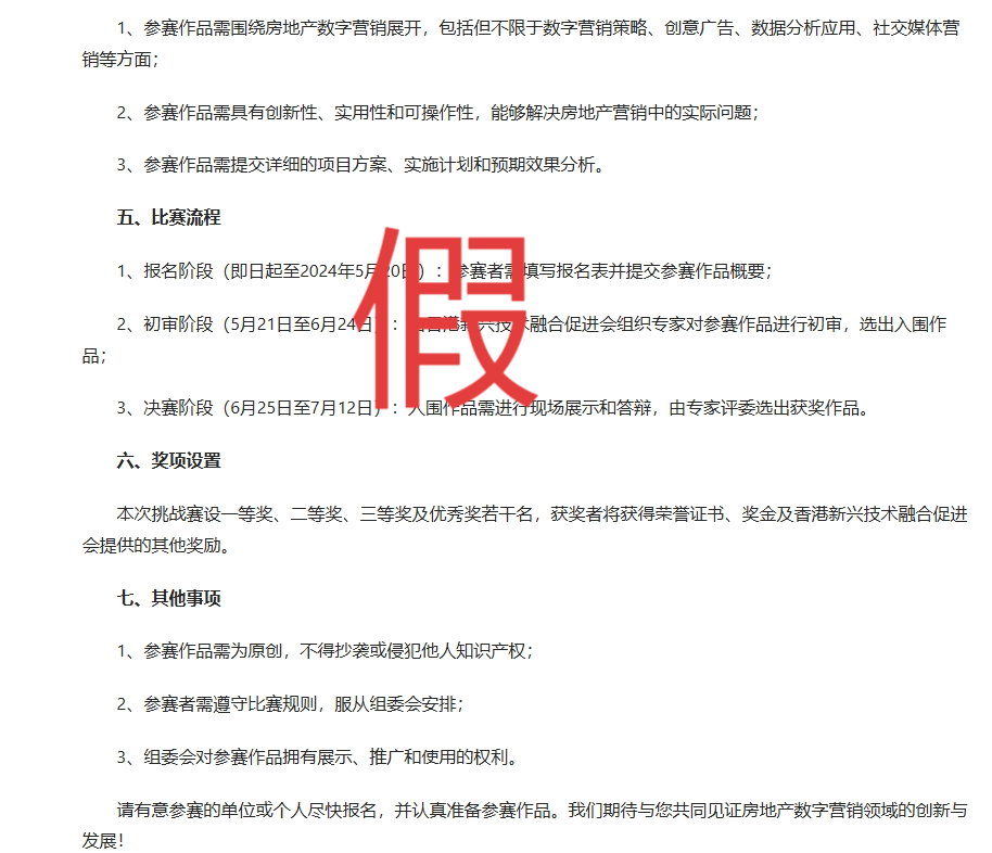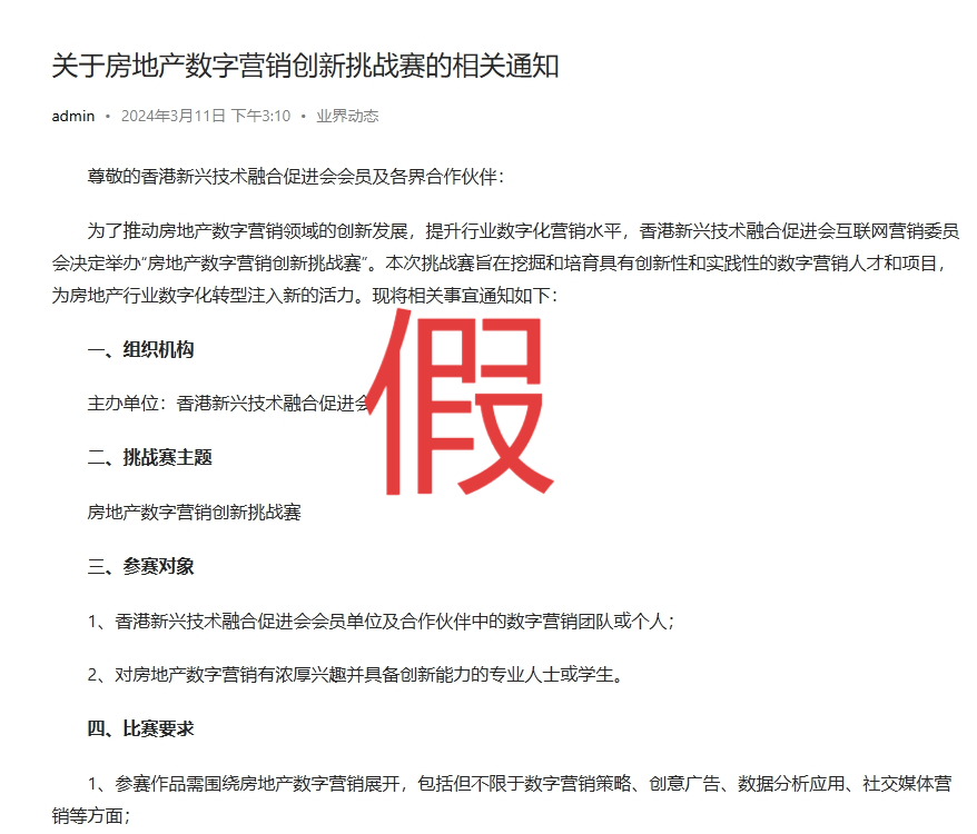 近日,我会接获会员及社会各界反馈,发现有人假冒香港新兴技术融合促进会(以下简称“我会”)名义,发布关于“房地产数字营销创新挑战赛”的相关通知,并以我会为主办单位,开展所谓报名及组织工作。经核实,我会从未授权或主办任何此类活动,亦未成立任何所谓互联网营销委员会,更未举办过“房地产数字营销创新挑战赛”。上述信息均为虚假内容,请广大会员及社会各界提高警惕,谨防受骗。